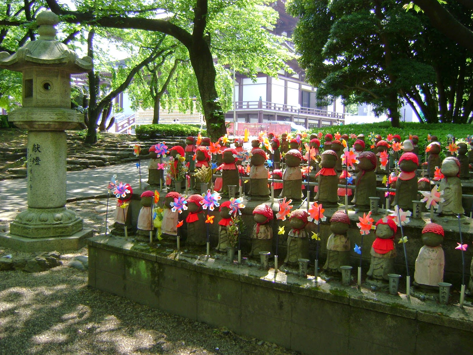 the little stone statues are jizo - the buddhist protectors of babies that either died before/just after/during birth or unborn. parents often buy these little red hats to clothe their jizo and leave flowers and small toys.